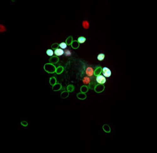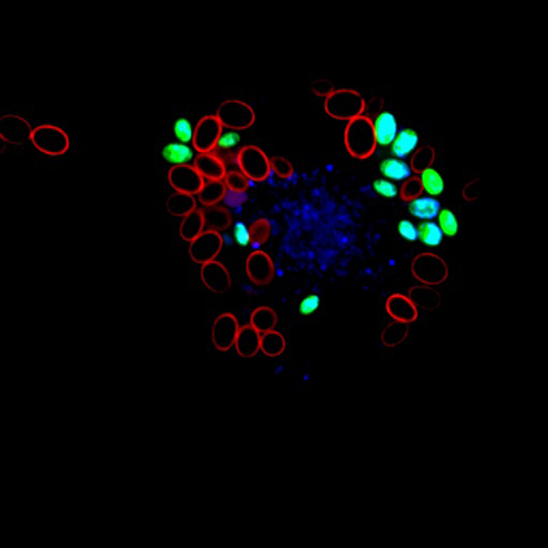 Candida glabrata ingested by macrophages. Live yeast are labeled in red, whereas killed yeast are in an acidified compartment labeled in blue/green.
