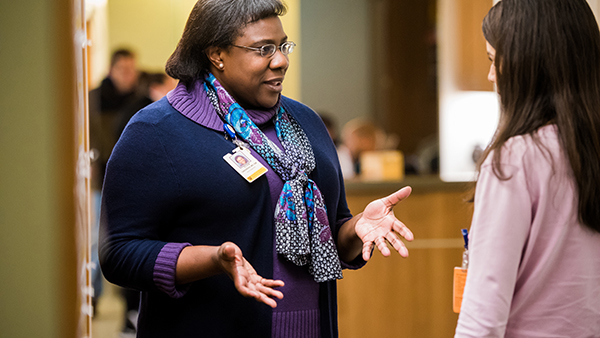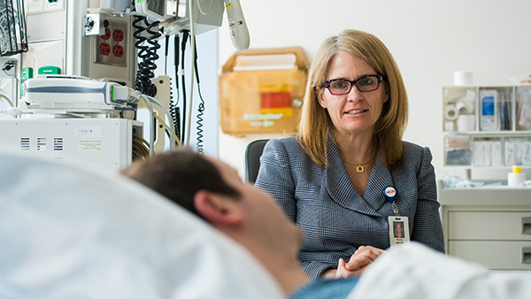 Felicia Smith, MD, speaks with a patient in the hospital.